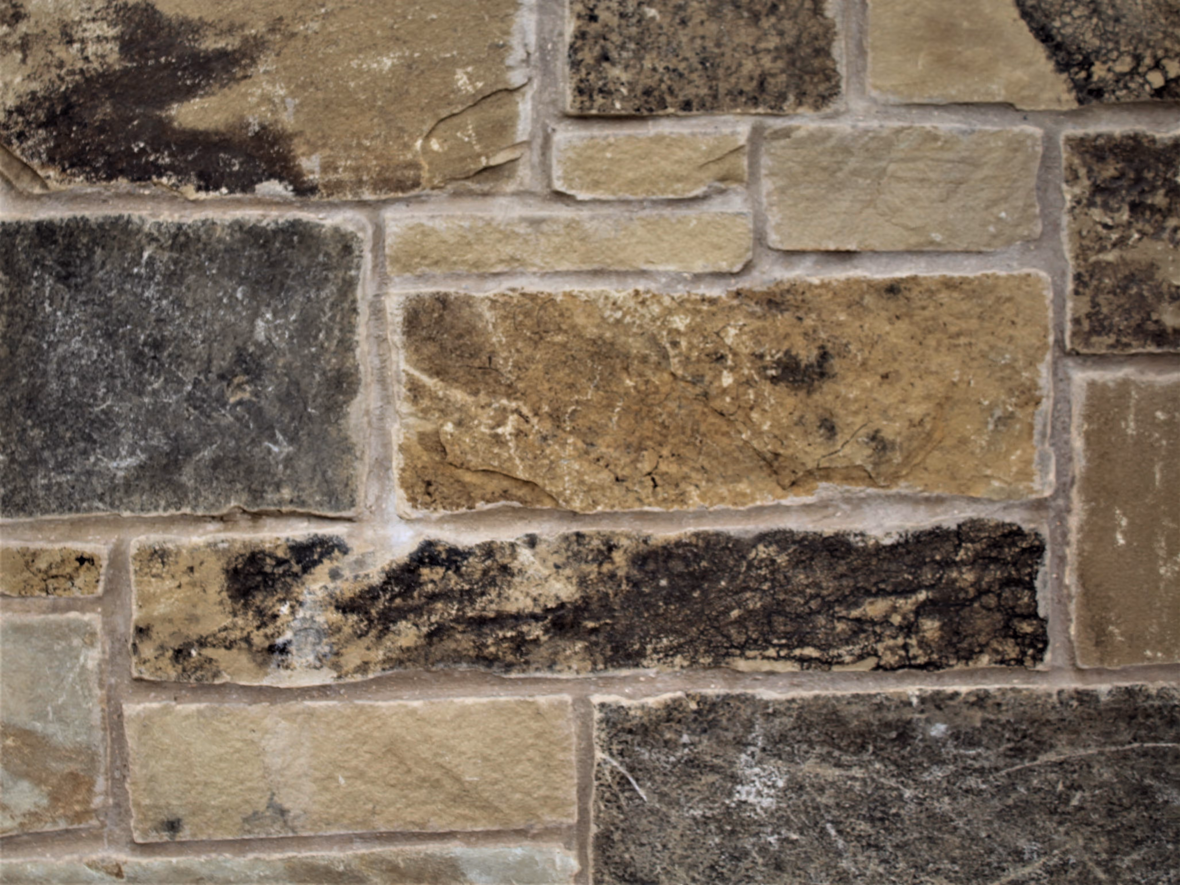 A sandstone with black and brown accents, often spotted with grey and orange highlights.